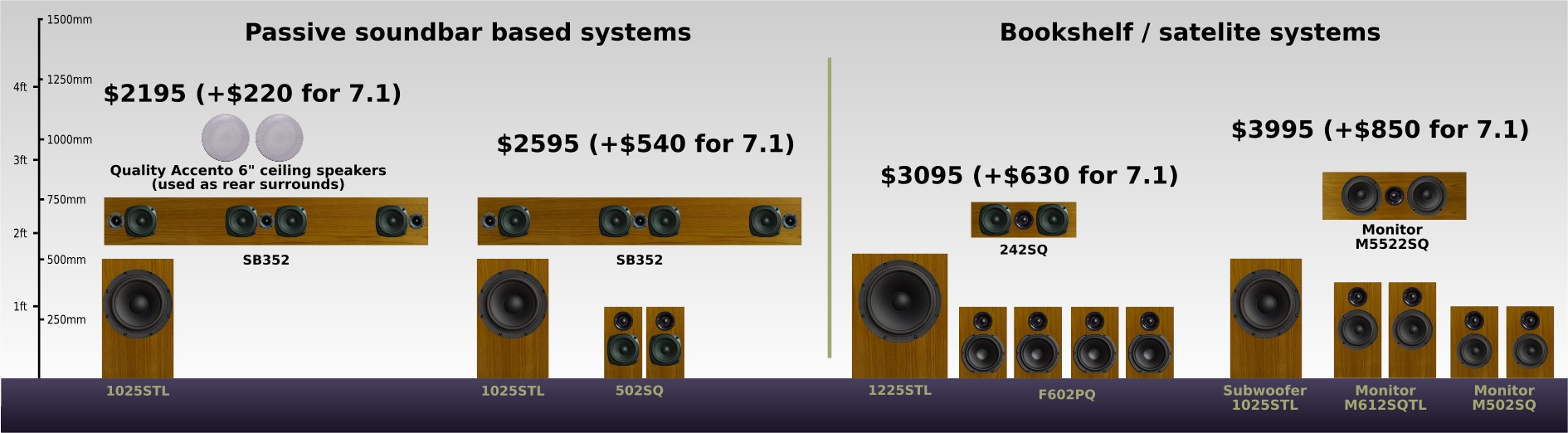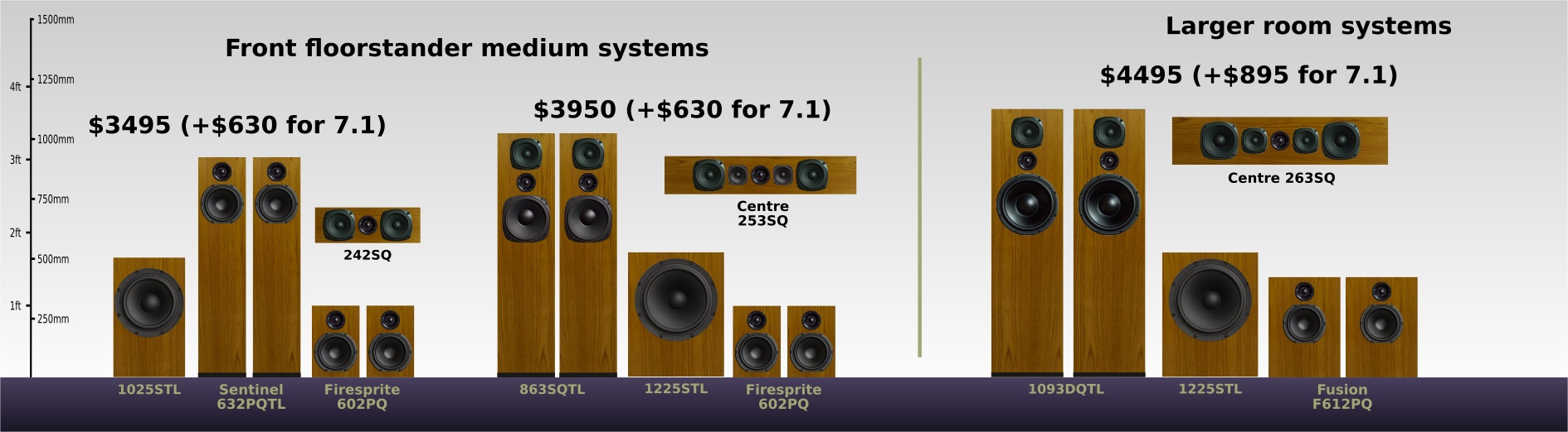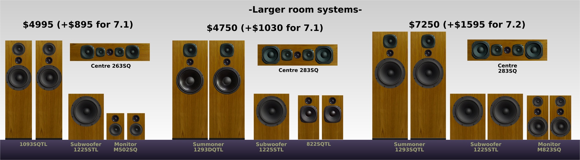 You are quite welcome to mix and match our various speakers to suit your own needs if you know what you want. Or you could choose from a few of our suggested system combinations here as a general guide. Many different systems are possible. Just add the speakers from the series that you want, to create the exact configuration you want.